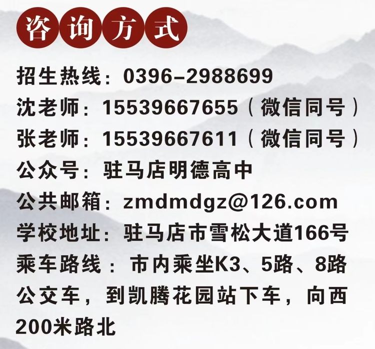 长风破浪会有时,直挂云帆济沧海。2022年,学校招生工作正在进行中,欢迎学生家长前来参观报名。高一新生计划招生6个班,高三复读生计划招生2个班。金秋九月,驻马店明德高级中学敞开心怀期待与你相遇。选择明德复读的学子,相信在这里经过一年的学习,定能实现凤凰涅槃,浴火重生!(朱剑锋 邓青 刘成汉)
