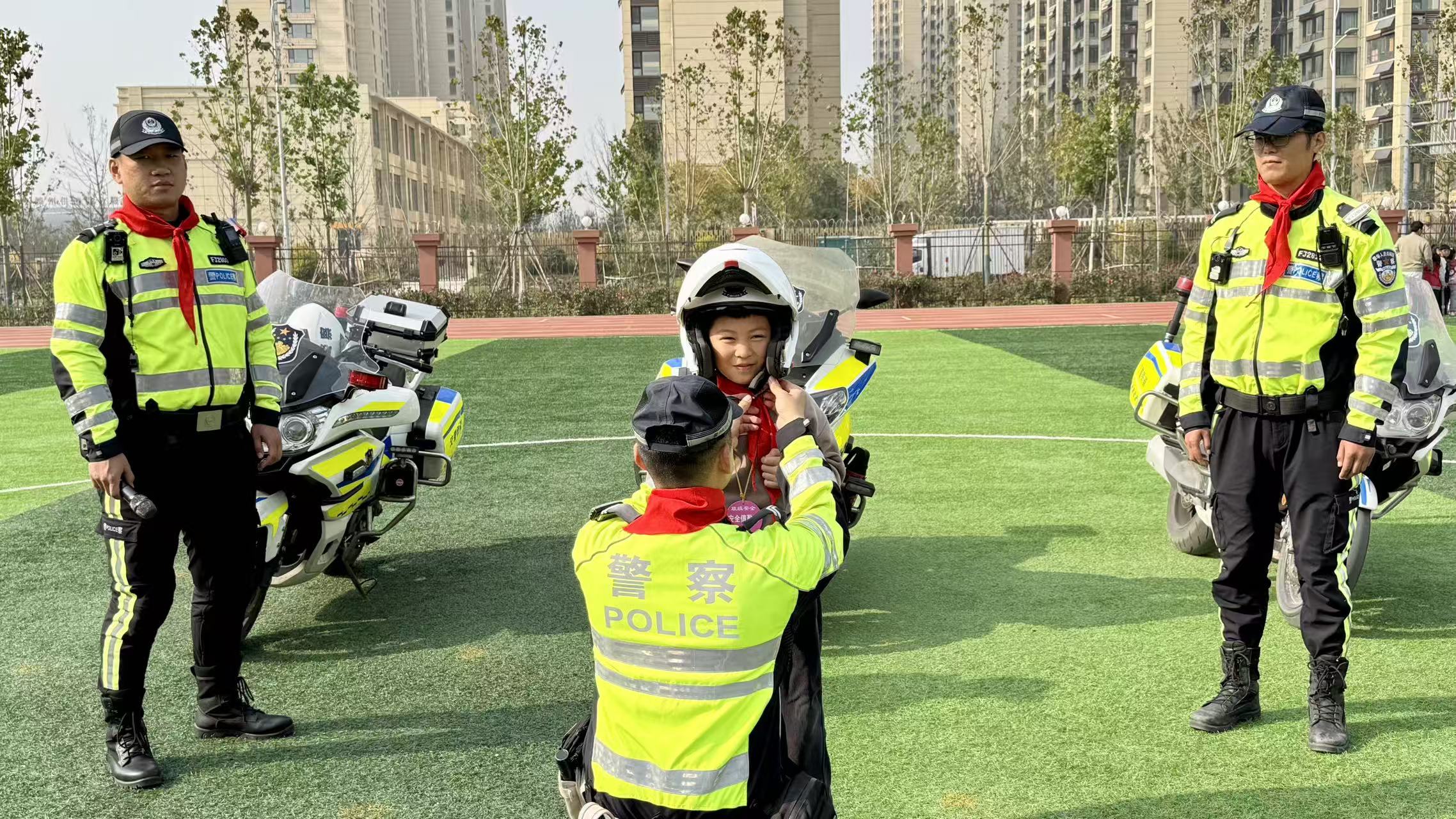 在护具使用演示环节,民警现场示范头盔正确佩戴方法,手把手指导学生系紧安全扣、调整佩戴角度,纠正常见错误佩戴方式,让学生直观掌握护具使用要点。此次活动通过“讲解 + 实操”的模式,有效提升了学生的交通安全意识和自我防护能力,为构建平安校园、保障学生出行安全筑牢了坚实基础。